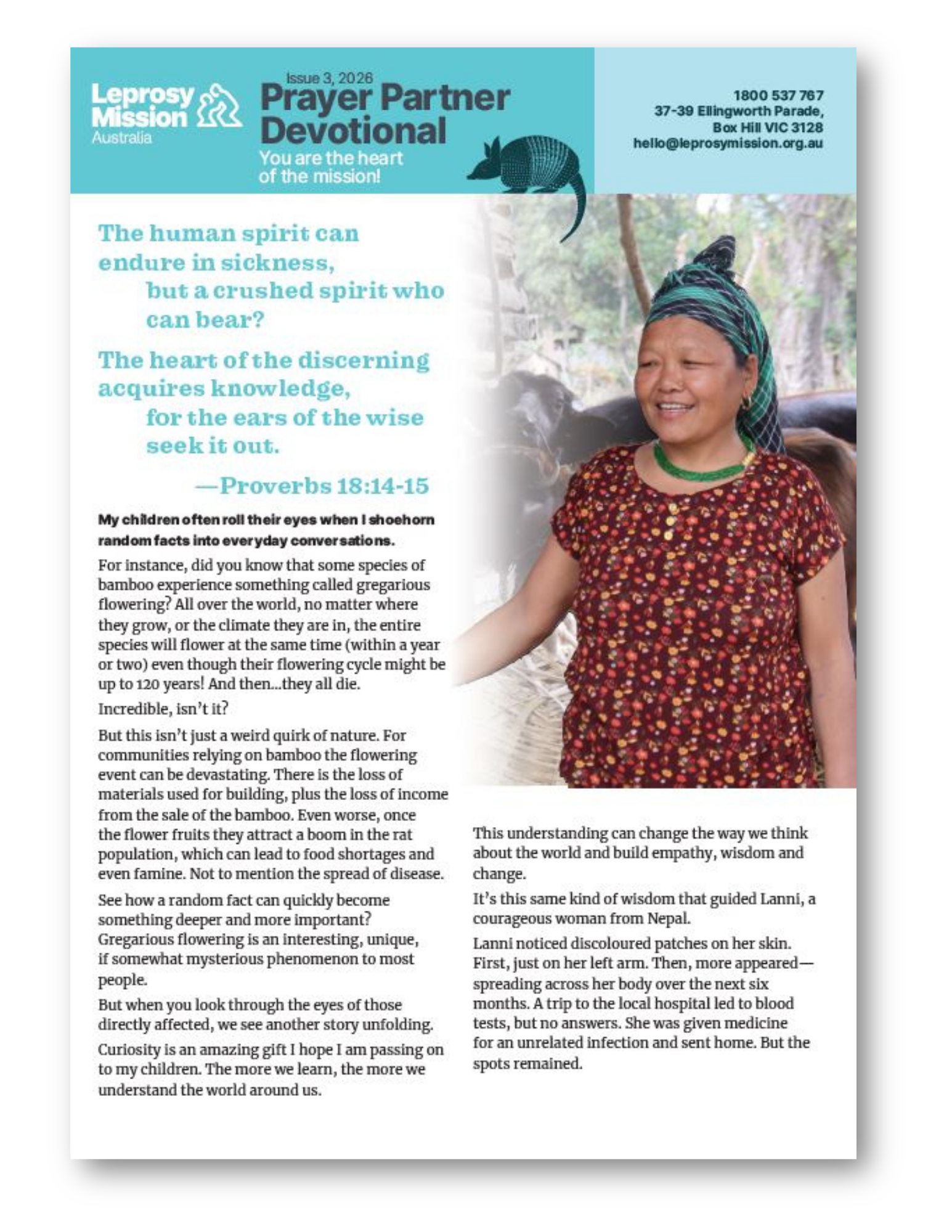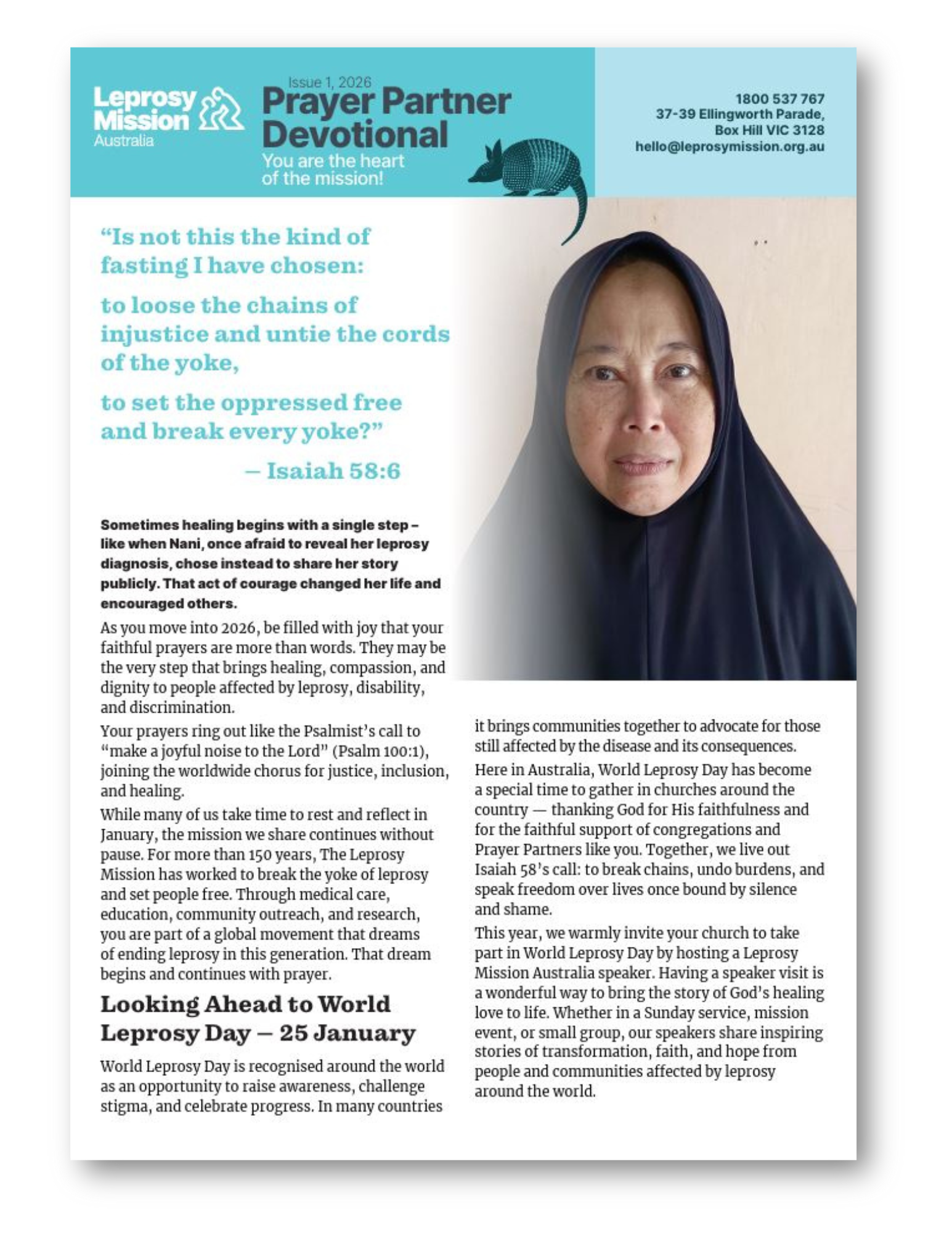 You are invited to pray alongside many others around Australia. Your ongoing prayers are needed to help make leprosy a thing of the past. Each month you can learn how you make a difference through a devotional style newsletter, focusing on how God impacts the lives of people affected by leprosy. Each day you can pray for specific needs, bringing dignity and a brighter future to many. Thank you for being a beacon of hope and love.