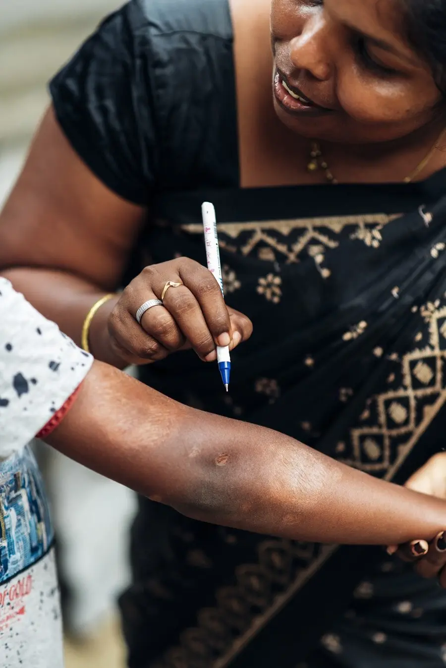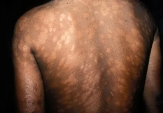 The patches are a different colour from the rest of the skin. They have no feeling if they are touched. If you notice a patch of skin like this, speak to a health worker as soon as you can.