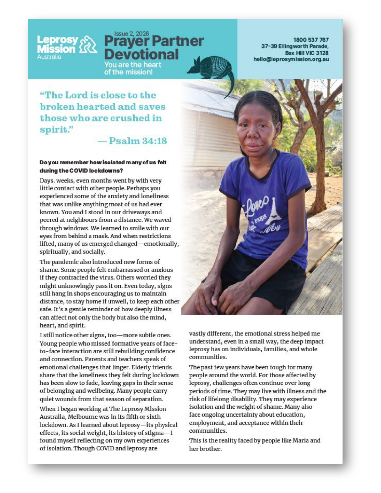You are invited to pray alongside many others around Australia. Your ongoing prayers are needed to help make leprosy a thing of the past. Each month you can learn how you make a difference through a devotional style newsletter, focusing on how God impacts the lives of people affected by leprosy. Each day you can pray for specific needs, bringing dignity and a brighter future to many. Thank you for being a beacon of hope and love.