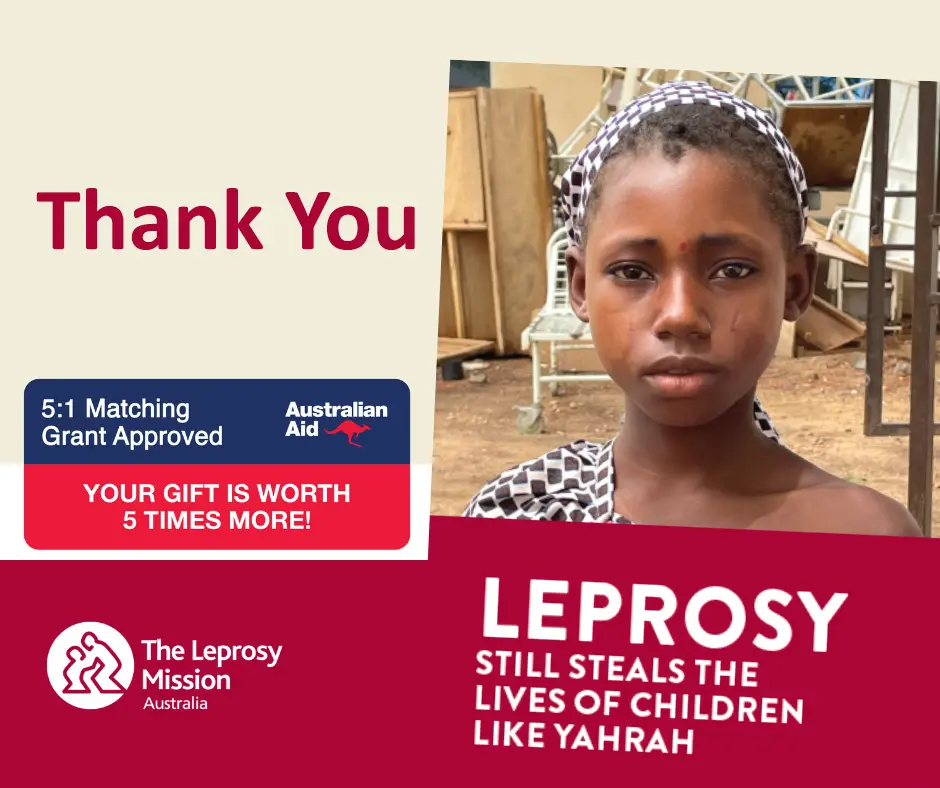 Thank you again for everything you do for people with leprosy through The Leprosy Mission, and especially now as you help children like Yahrah with your 5:1 donation.